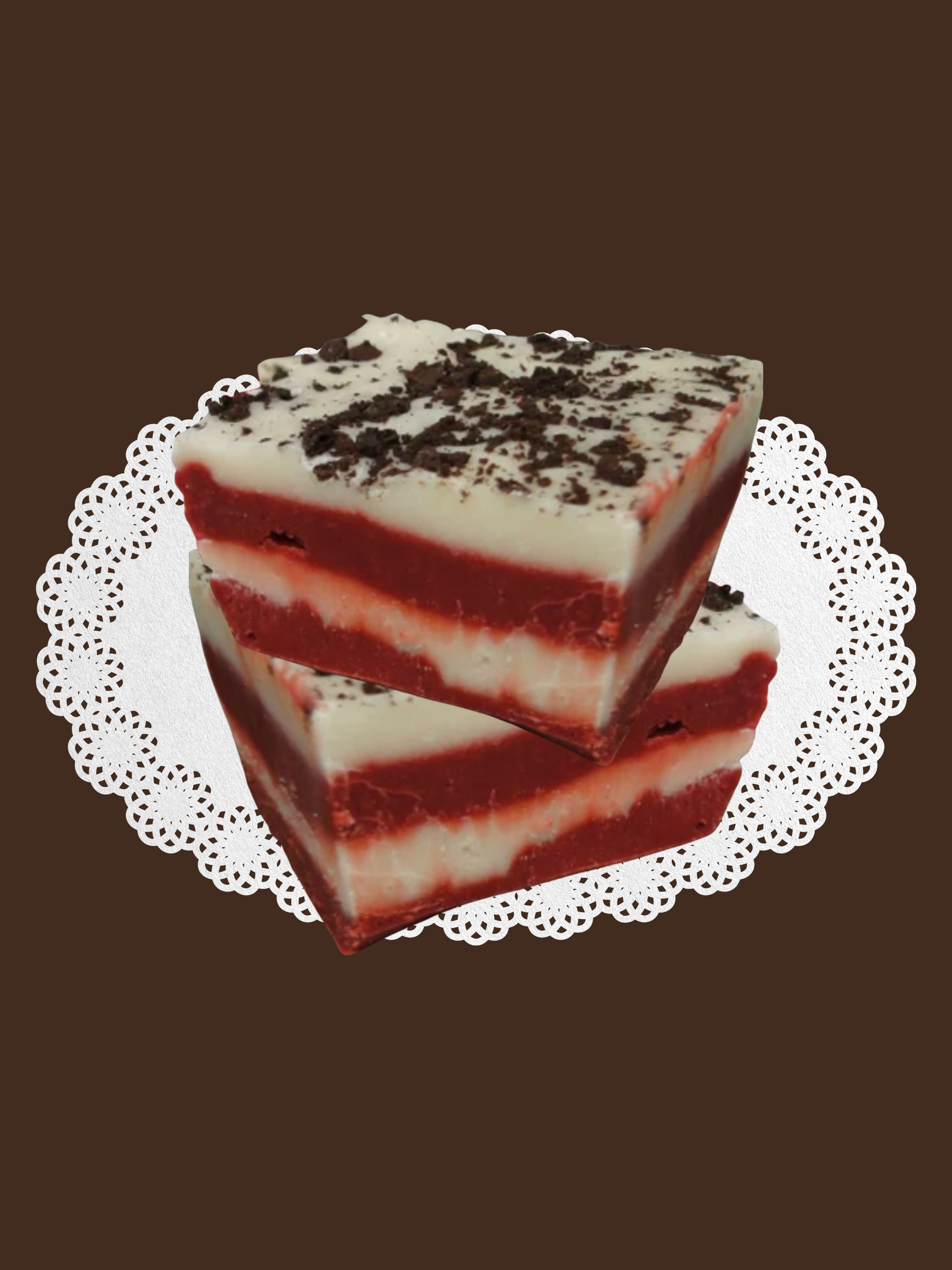 A delectable masterpiece. This decadent rich red & white fudge exudes the cream cheese flavor and is better than any Red Velvet cake you've ever had.